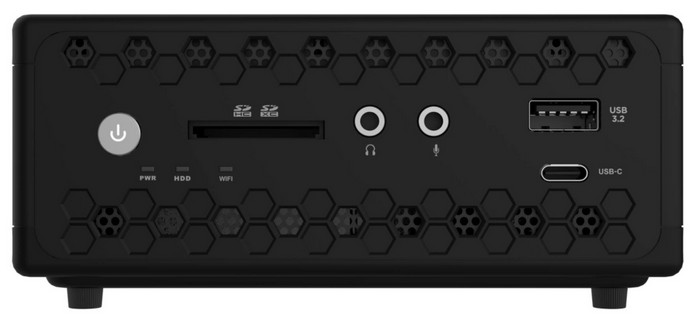内集成WiFi和蓝牙模块,前面包括:读卡器、耳机和麦克风插孔,以及一个USB 3.2 TYPE-A和一个USB-C接口;背面有两个HDMI输出和一个DisplayPort,两个USB-A和双千兆LAN。