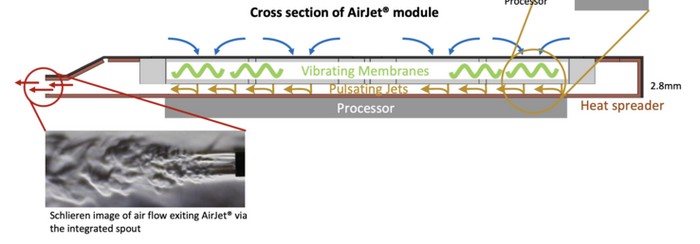 没有看到切割截面图,但官方展示用 AirJet Mini 散热器可以吹动风扇,这说明超声波震动产生的气流并不小。另外,现场NBC表示,会有一些噪音,不过并不大,是类似一种高频的声音,不仔细听还是很无感的,远比风扇的噪音小的多。