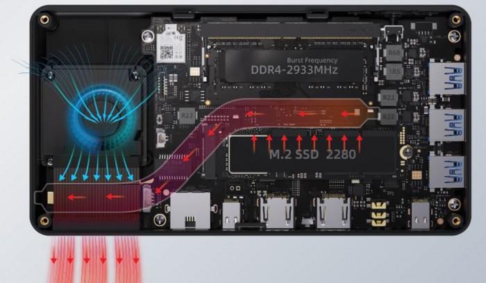 内采用主动散热方案,配有一把涡轮风扇,最高转速5500转,热管导热。
