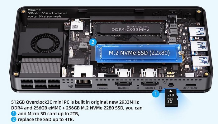 重点是扩展,它提供一条SODIMM内存槽,可支持高达32GB DDR4-2933MHz内存;储存方面,除了板载eMMC 5.1存储外,还提供一个M.2 2280 SSD 扩展槽,还不够的话,还有microSD读卡器。