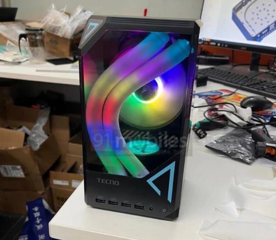 MegaMini 是一款迷你主机,前脸透明设计,内用上了水冷,机身前脸上下有切角设计。另外前面底部有4个USB-A接口和3.5mm耳机插口等。