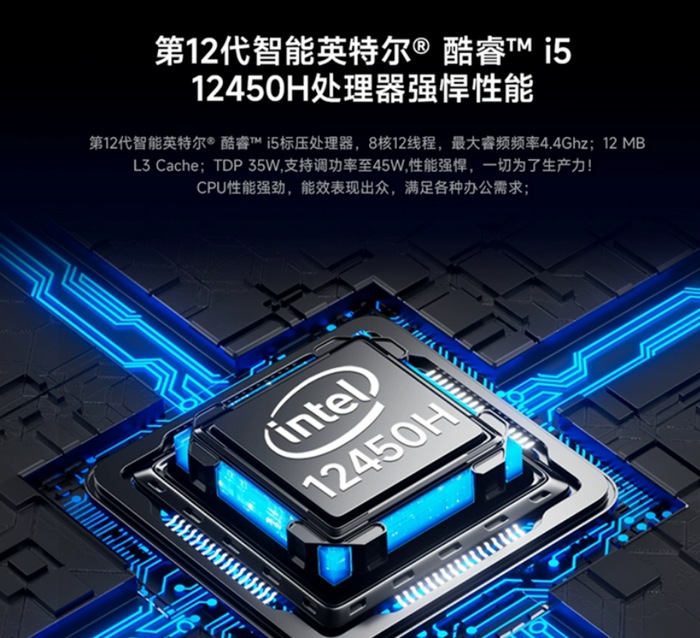 内搭载英特尔 第12 代酷睿 i5-12450H 标压处理器,8核心(4E+4P),最高睿频 4.4GHz,集成 48EU 核显,核显大致性能和 NVIDIA GeForce MX130 差不多。