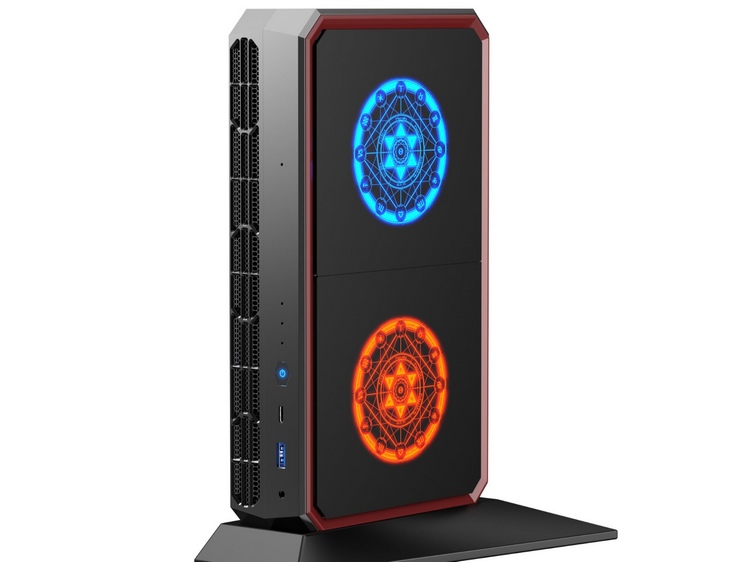 铭凡 HX200G 机身紧凑,带底座可以竖置摆放,两侧有 RGB 装饰(或可以自定义图案)。当然,你也可以将它装在显示器背后使用。