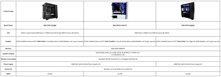 定位最高的是 MEK HERO A7748S,搭载锐龙7 7700X 处理器(8核心/16线程),搭载 RTX 4080 Super 显卡,800W 金牌电源,售价2299美元(约1.65万元)。