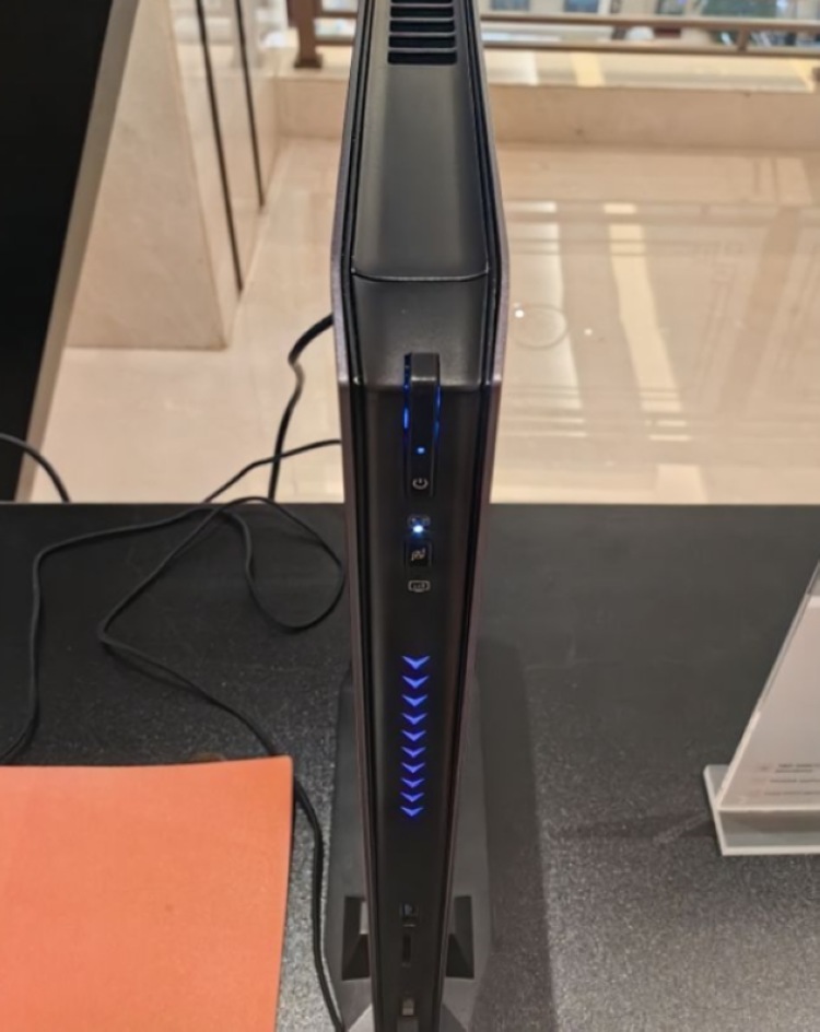外观比较独特,竖置摆放,机身很薄,官方叫它“立式刀片”设计。机身两侧是金属材质,有“原子侠”LOGO,机身前面有RGB灯效点缀。机身尺寸为:396.5 x 236.4 x 32.5mm,带支架。