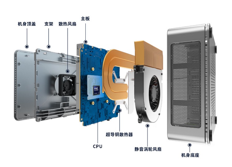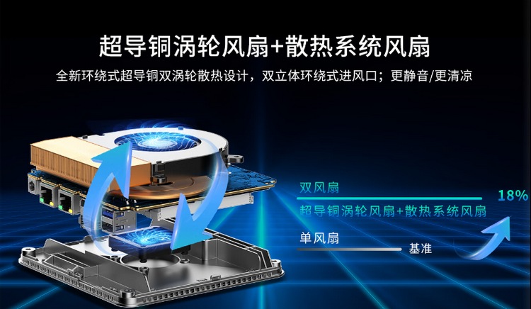 还是银色金属机身,比较简约,尺寸为128.8 x 127 x 47.8mm;内采用双风扇,顶部是单涡轮+双热管+纯铜散热鳍片散热器,负责压制处理器;而底部背面还有一个风扇,双风扇可以带来更好的散热,处理器/硬盘温度比单风扇低6摄氏度、机身温度低2摄氏度左右。另外,提供三档运行模式,性能模式下最高65W性能释放。