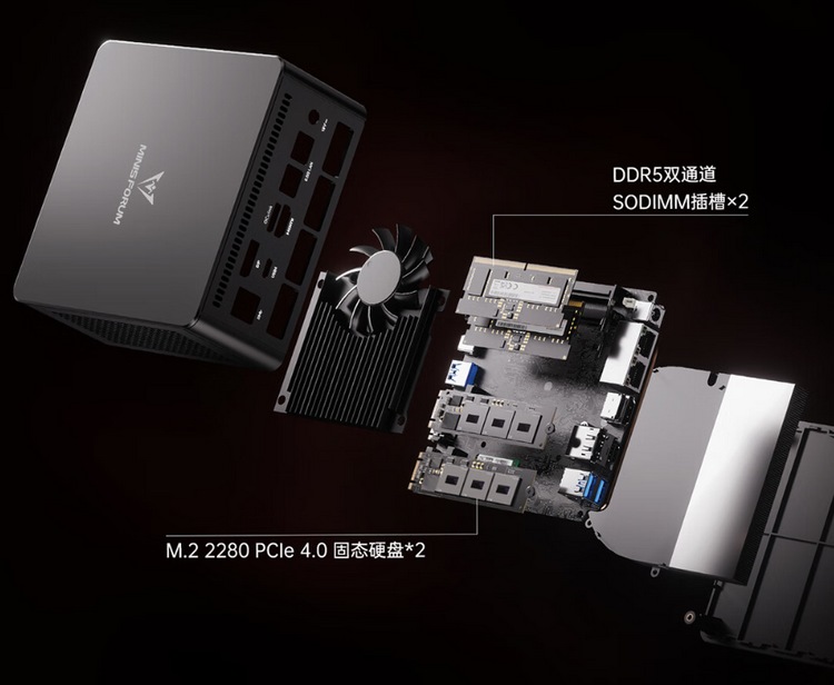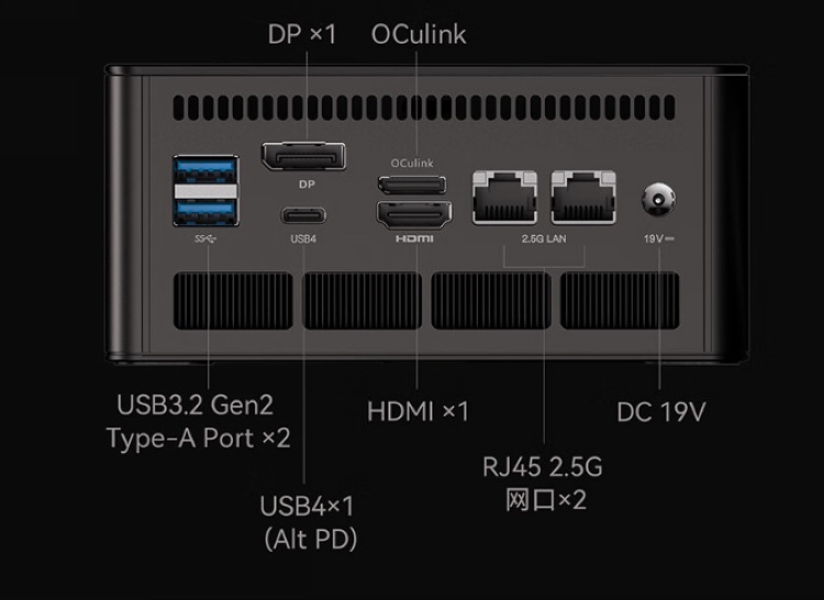 扩展方面,包括:双USB4(40 Gbps)、4个USB 3.2 Gen 2 TYPE-A、HDMI2.1、DP 1.4、双2.5G千兆LAN、耳麦插孔和OCuLink (63 Gbps),可以外接独显。