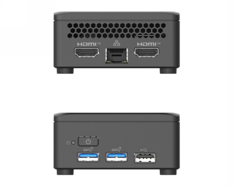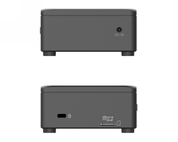 常规方盒子设计,顶部大面积透气孔,非金属机身,巴掌大,尺寸为 80 x 80 x 36毫米,比普通迷你主机小一圈儿,占用更小的桌面空间,还支持 VESA 壁挂。
