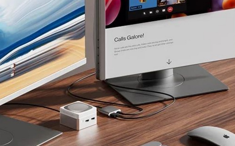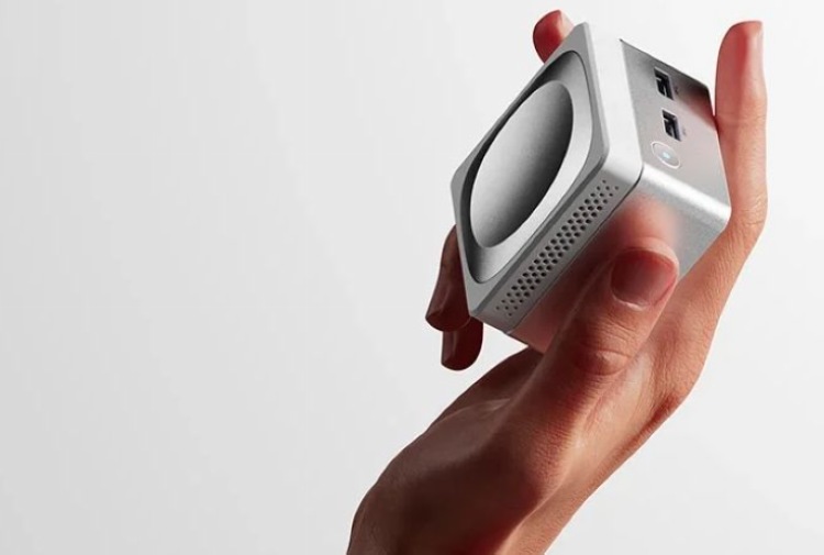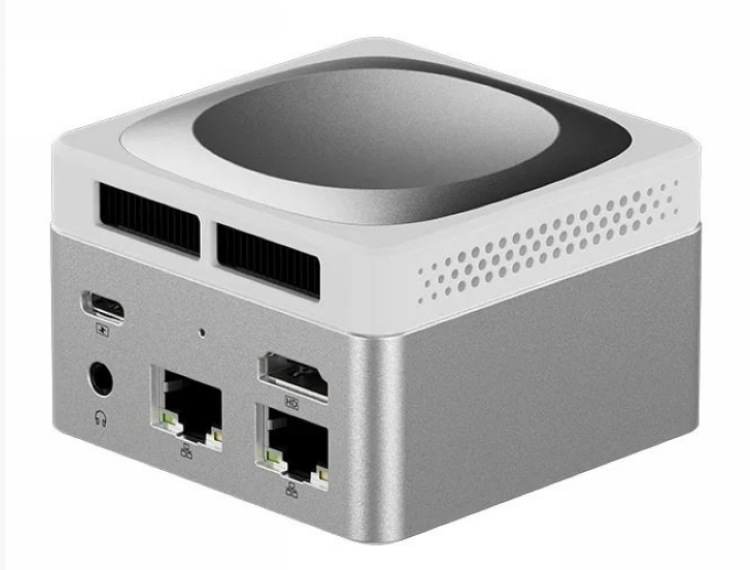 银白配色,顶盖猛一看还以为带喇叭;个头不大很小巧,尺寸只有 73 x 73 x 43mm ,比传统迷你主机要小的多,不占用桌面空间,也方便携带收纳。