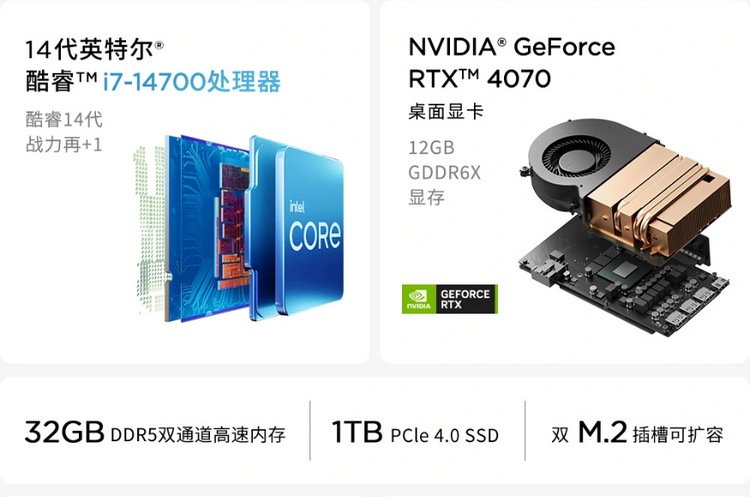 亮点都在内部,搭载英特尔酷睿i7-14700 处理器,配备32GB DDR5 内存和 1TB SSD,重点是它还配备了RTX 4070 显卡,这在迷你主机中很少见,有印象的是索泰的 ZBOX 也这搞,适合对游戏/渲染等专业用户。