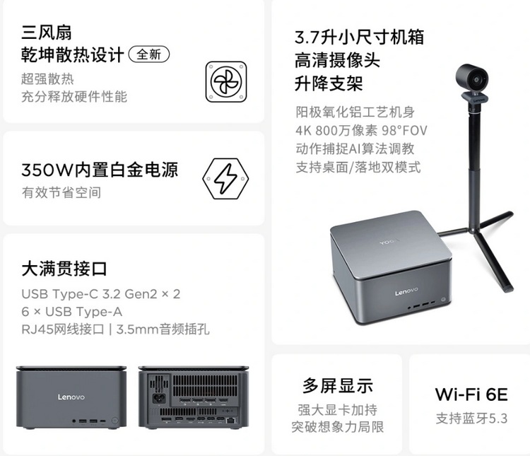 强大的配置需要更好的散热,内采用定制散热器,有三把风扇,具体散热表现没说,其中显卡部分有一把涡轮风扇,用3热管压制。另外,送一个外置磁吸式800万摄像头,支持4K视频,还号称可以3D数字人制作。再有,内置了 350W 电源,集成喇叭,支持多种AI创作功能。