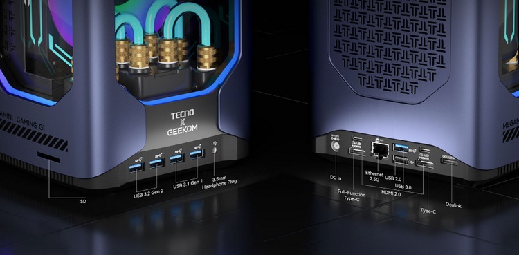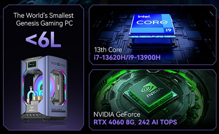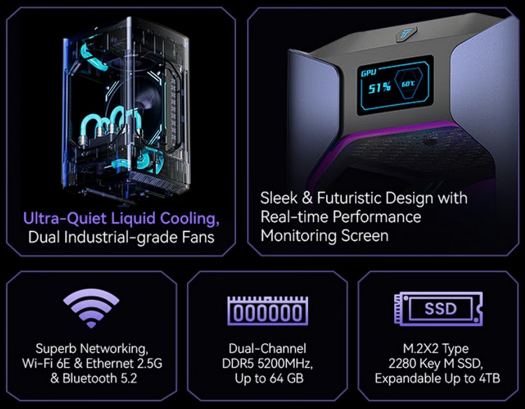 具体来说,只有5.74升,3.7公斤重,机身采用阳极化铝材质打造,机身有大量 RGB 灯效点缀,营造除科幻未来主义。顶部带有屏显,可以显示CPU/GPU的使用情况,以及温度等。